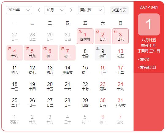 10月1日(周五) - 10月7日(周四) 共放假 7 天;