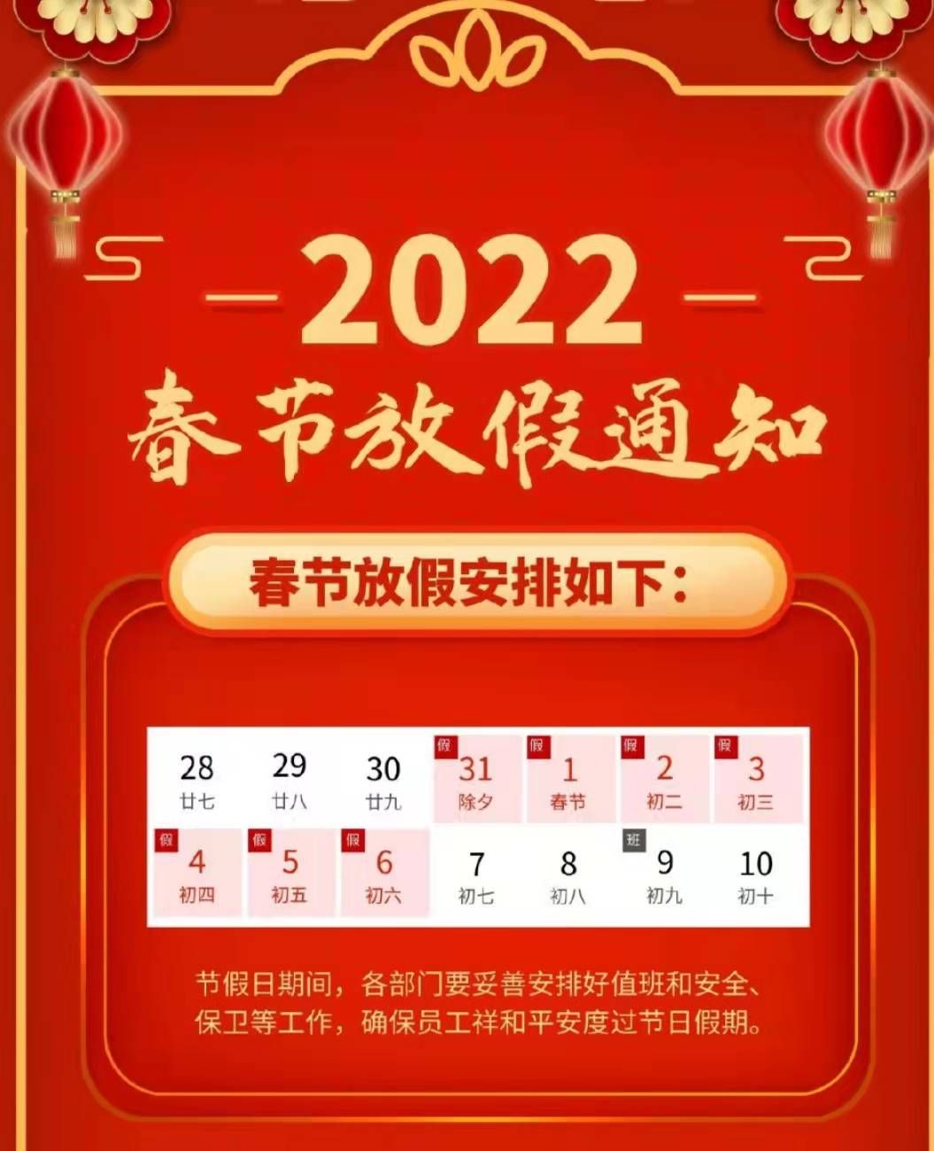 根據(jù)《國務(wù)院辦公廳關(guān)于2022年部分節(jié)假日安排的通知》規(guī)定,結(jié)合公司實際情況,現(xiàn)將2022年“春節(jié)”放假安排如下:
