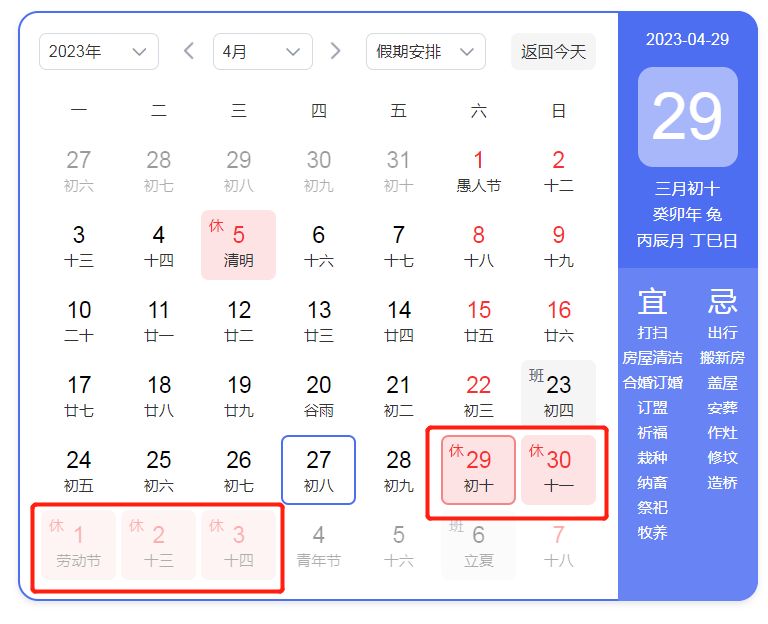 根據(jù)《國(guó)務(wù)院辦公廳關(guān)于2023年部分節(jié)假日安排的通知》,2023年勞動(dòng)節(jié)放假安排:4月29日至5月3日放假調(diào)休,共5天。4月23日(星期日)、5月6日(星期六)上班。