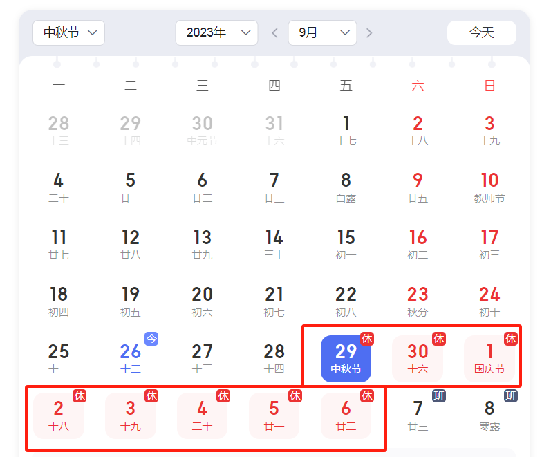 根據(jù)《國務院辦公廳關(guān)于2023年部分節(jié)假日安排的通知》,國慶節(jié)放假時間為9月29日至10月6日放假調(diào)休,共8天。10月7日(星期六)、10月8日(星期日)上班。